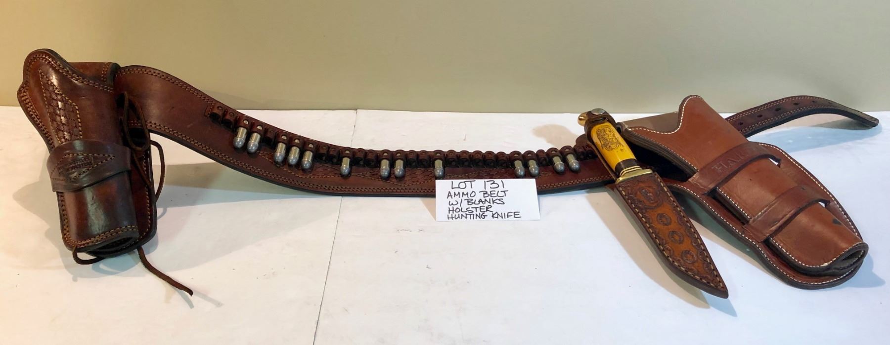 LEATHER AMMO BELT W / .45 COLT BLANKS, DBL HOLSTER, HUNTING KNIFE